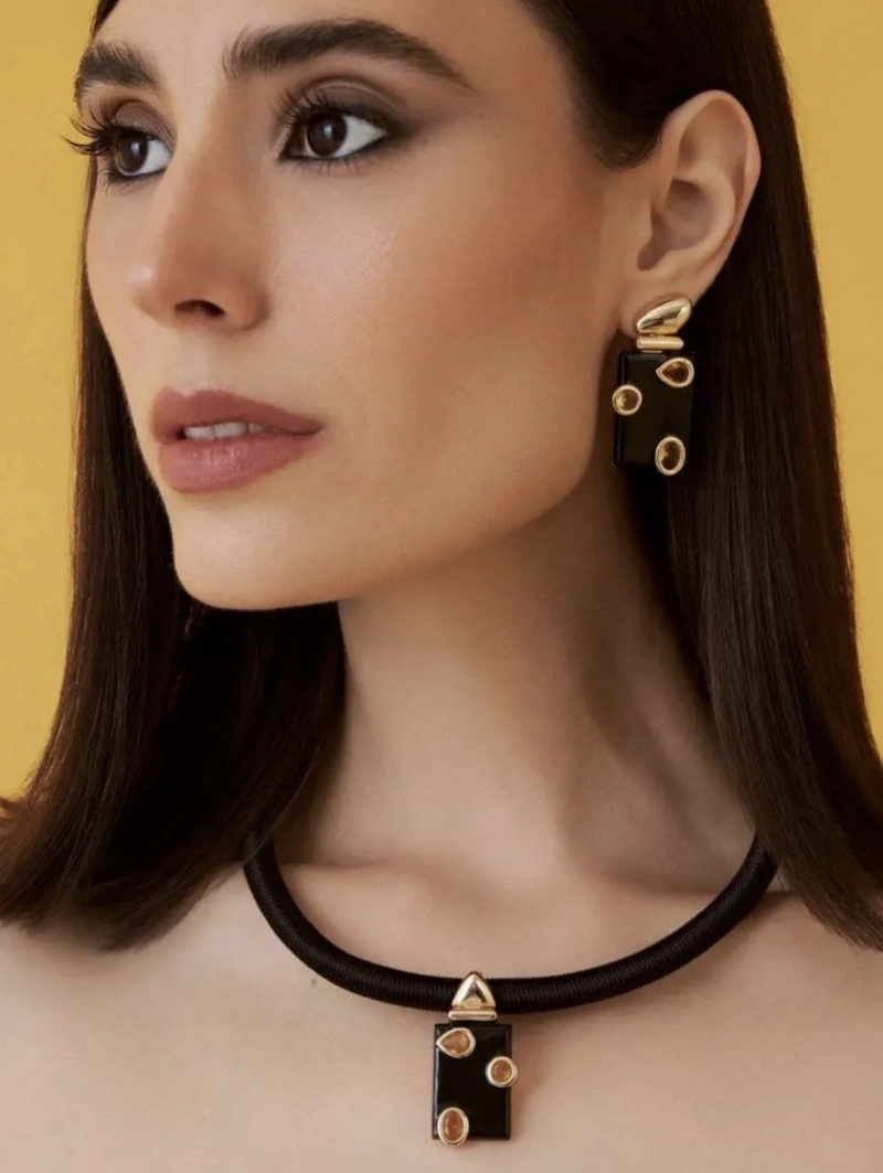 Brinco Geométrico Esmaltado Preto Cristais Amarelos