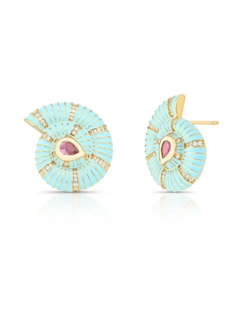 Brinco Caracol Esmaltado Turquesa e Cristal Rosa